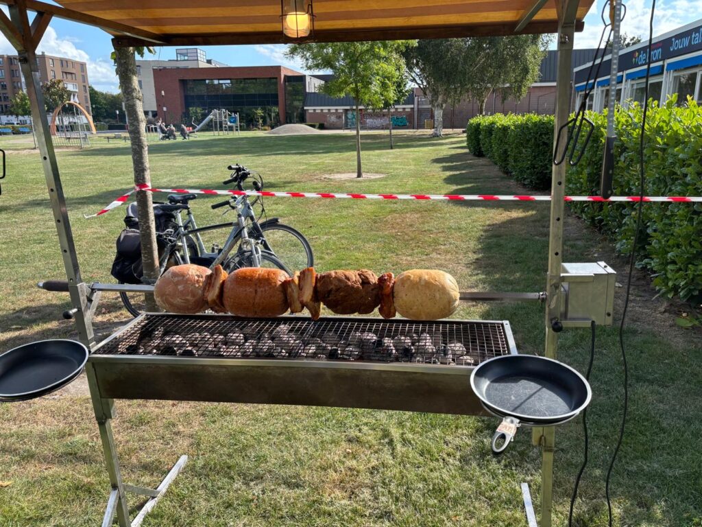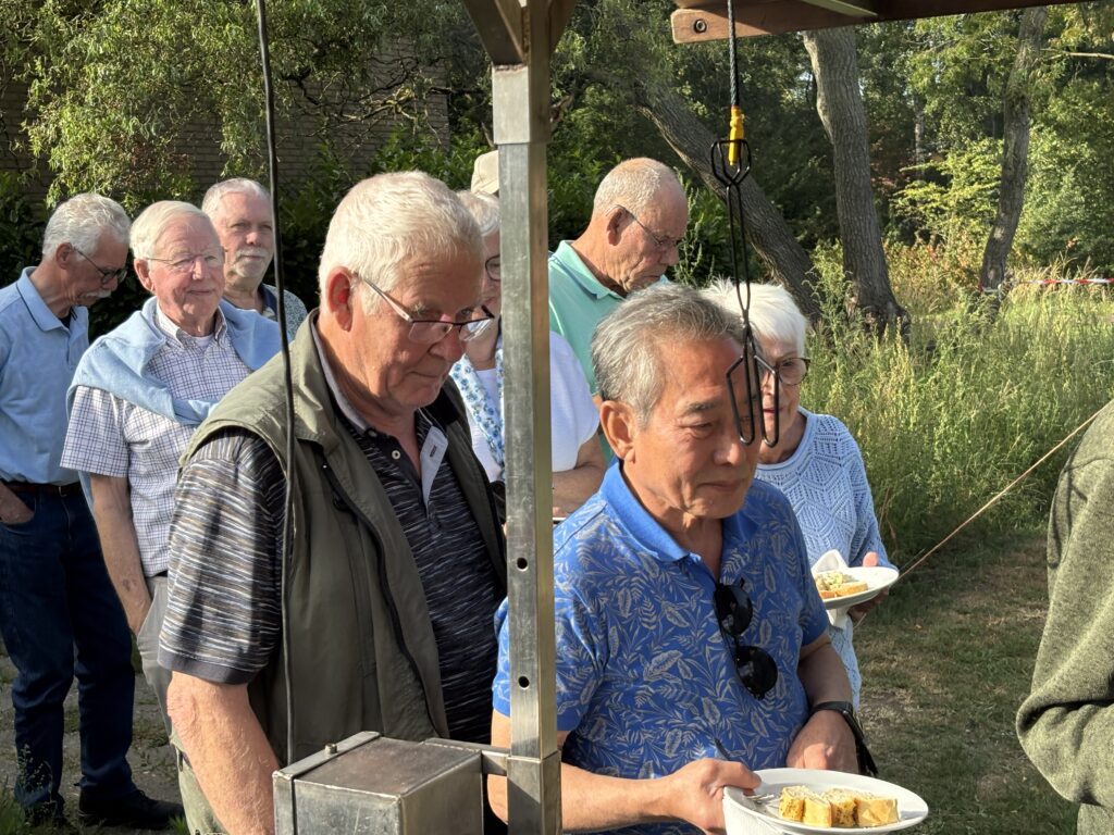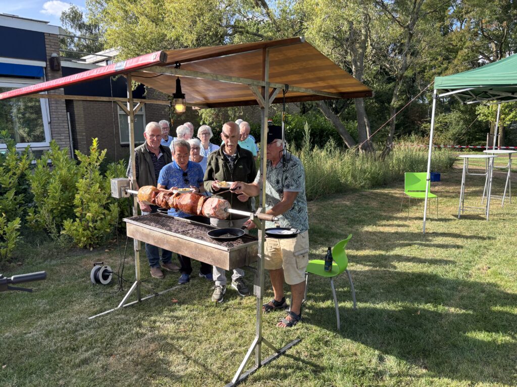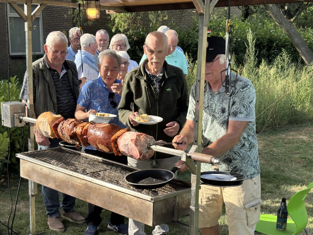 Ruud hield de uitslagen van de wedstrijden bij op papier, deze werden vervolgens binnen ingevoerd in de computer door Otto. De cateraar kwam de BBQ opbouwen en de mega spies en de salades brengen.Megaspies met varkensvlees, kippenvlees, buikspek, rundergehakt en beenham. Robert Rekké (Secretaris) zal de rituele vlees aansnijding doen.De uitgifte van de dranken en het gebak werd gedaan door Lidi en Wim van Keulen en door Betty Aalderink.De salades staan klaar.Om de beurt werd er per tafel vlees uitgedeeld.David Su zegt: “makan apa hari ini?”Eén van onze sponsoren , Niels Smelter (links) van “Auto Smelter” was er ook.