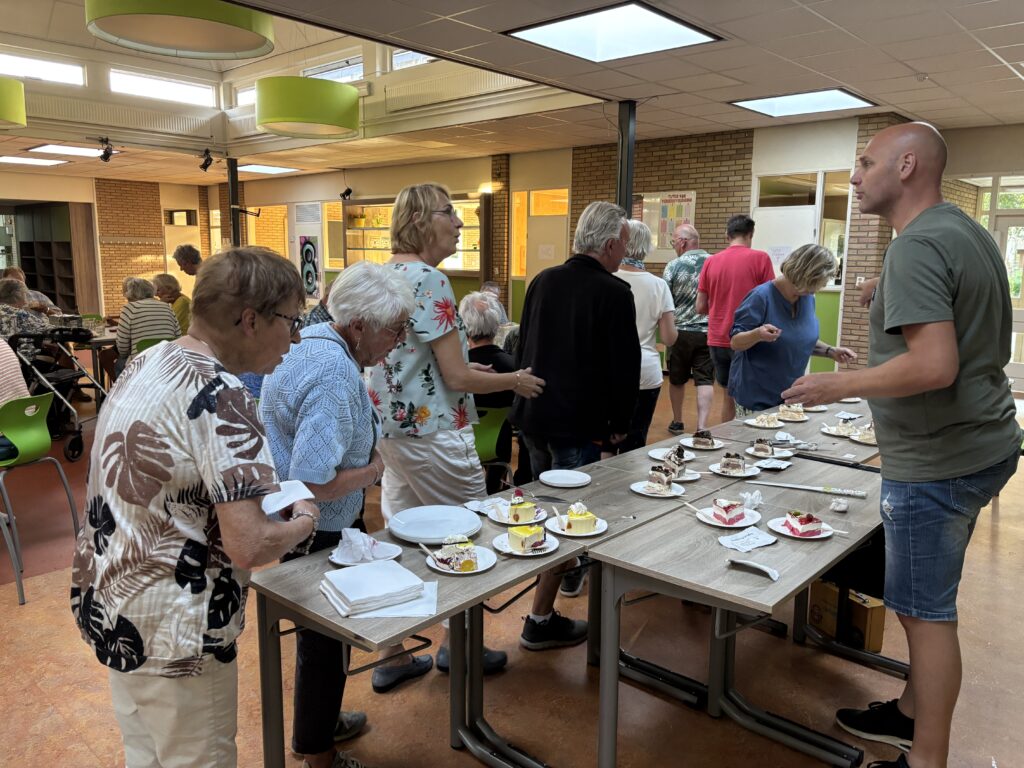 Taarten beschikbaar gesteld door een anonieme donateur.Manon kon er niet bij zijn op deze donderdag, daarom hadden Otto Hoen (links) en Ruud (rechts) de wedstrijdleiding.Iedereen kreeg 5 consumptiebonnen, deze werden uitgedeeld door Robert Rekké (links)De eerste leden doen zich tegoed aan een stuk taart.Ons jongste lid Maxim Leferink schrijft zich in.Er was een grote opkomst. Het feest werd gehouden in de hal van de Basisschool “De Bron”.Omdat er twee leden op het laatst pas afgezegd hadden moest er het nodige aangepast worden in het wedstrijdschema. Hierdoor moesten we iets later starten dan gepland. Maar door de gezelligheid was dat geen probleem.De oud-voorzitter Hans Leushuis (donker blauw shirt) met zijn vrouw Lidian, waren ook uitgenodigd. Alexander van Duursen (Voorzitter) opent het jubileumfeest met een duidelijke toespraak. Otto Hoen verteld hoe het verloop van de wedstrijden gaat en welke prijzen er te winnen zijn.